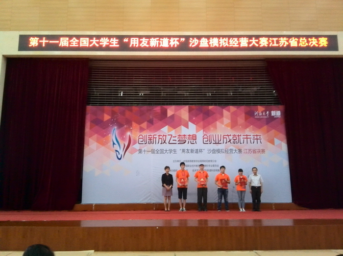 6月6至7日,“用友新道杯”第十一届全国大学生沙盘模拟经营大赛江苏省决赛(全国半决赛)在南京河海大学商学院举行。我校经贸学院带队参加该项目比赛,经过两天激烈角逐获得“一等奖”的佳绩,这也是我校经贸学院连续四年获此殊荣。
