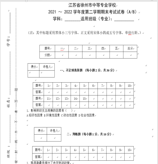 各二级学院、各部门: 根据我校实际,现对2021~2022学年度第二学期期末考试工作提出如下实施意见,请遵照执行。 一、组织领导 1.考试工作领导小组 组 长: 石月荣 副组长: 魏红光 成 员: 唐剑 孔扬 孙文振 李鑫 赵传晶 戴凌 高自力 权红莲 张军常 闫军 王晓斐 黄斌 曹元峰 主 考: 魏红光 2.考务工作 组长:孙文振 副组长:郭庆强 杜权 考务人员:高玲云 谢守魁 司立丽 朱艳侠 试卷管理:赵静 朱波 马艳林 3.安全防疫:赵传晶 蔡志国 4.卫生保洁:刘传峰 戴凌 5.车辆保障:唐剑 6.纪检监察:孔扬 7.考风考纪:李鑫 二、试卷命题、开考科目及安排 (一)关于中职考试科目及安排 1.第十四周各教研室进行教研活动,研究期末考试复习重点及考试范围,商讨期末考试的命题,并将命题工作责任到人。中职班级的语文、数学、英语和专业课,教研室按照《教考分离工作实施办法》进行命题、阅卷和登分。教研室将每套试卷的审核单、试卷A(含答案)和试卷B(含答案)分开装订,试卷标题请标明A、B卷。本次教研活动由各教研室主任分别召集进行,做好签到和活动记录工作。 2.教研室命题时应以学业水平考试教学基本要求为准,以基础知识为主,注重能力考查,根据学生的实际情况命题。单招班:语文150分钟,数学120分钟,英语120分钟,专业综合150分钟;就业班:语文90分钟,数学60分钟,英语60分钟,专业课60分钟。各学院及教研室可根据实际情况进行多样化的考试形式尝试,评价手段力求创新,突出理实一体化,突出能力的考核。6月1日中午12:00前各教研室主任将考试科目安排表、试卷清样纸质稿和审核单签字后统一送交教务处,6月9日考完后将考试科目试卷电子稿上传泛雅平台( “期末考试试卷样卷”目录中)。 3.试卷清样要规范,一律采用计算机打印,试卷标题写清学科、适用班级(专业)。试卷标题样式:(见教考分离模版A型和B型)